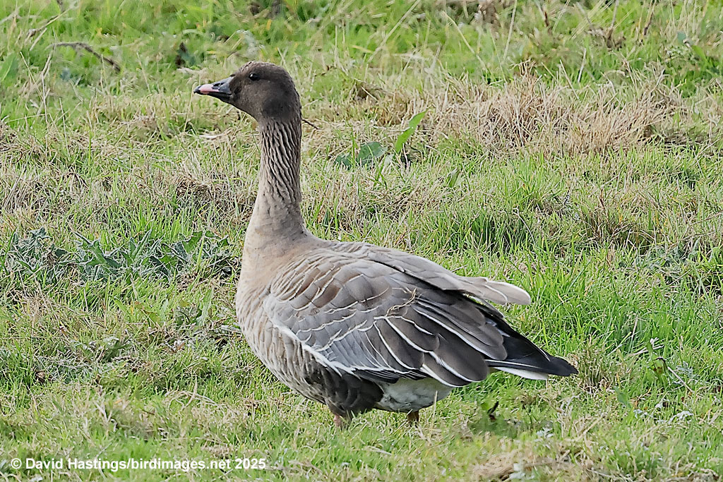 Pink-footed Goose (Anser brachyrhynchus). Taken at Overy Marshes, Norfolk, on October 13th 2025. Taken at Overy Marshes, Norfolk, on October 13th 2025. (© David Hastings) (Canon R7+RF100-500, f/9, 1/400th, ISO1250, 500mm. Click image for larger version) Description L: 64 - 76 cm; WS: 137 - 161 cm This species is very similar to the Bean Goose, but has pink rather than orange legs, and a short stubby bill. It breeds in Greenland, Iceland and Svalbard. The Greenland and Iceland populations winter in Great Britain, while the Svalbard population winters in the Netherlands and Denmark. Its breeding habitat is arctic tundra. Nesting is often on cliffs close to glaciers to provide protection from mammalian predators. It has Amber status on the UK list. Around 360000 birds over-winter here. Sightings | 15-Oct-2025 | : | Overy Marshes, Norfolk | (200+) | | 14-Oct-2025 | : | Cley Marshes, Norfolk | (4) | | 13-Oct-2025 | : | Overy Marshes, Norfolk | (200+) |