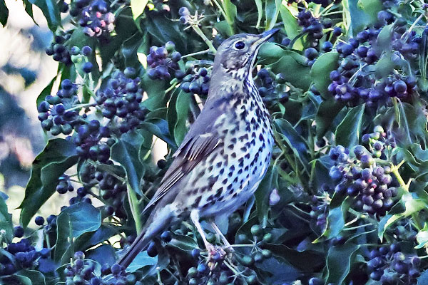 was feeding on Honeysuckle berries again this morning. No sign of the Song Thrush today though.