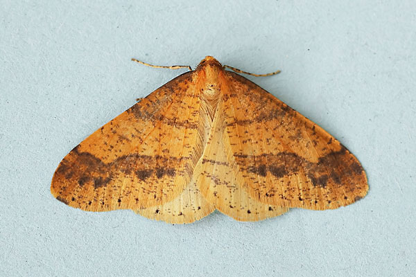 Male. Taken at Aston, Oxon., on November 7th 2025. (© David Hastings) (Canon R6+RF100, f/11, 1/200th, ISO2500, 100mm) DescriptionFamily: Geometridae (ABH : 70.254) Wing span: 34 - 42mm The male has a warm golden orange-yellow forewing with two distinct cross-lines, often a central spot and with variable greyish-brown edging, blotches and freckling. The female is flightless. It can be found throughout the British Isles, but is local in Ireland. It is most abundant in open broad-leaved woodland with mature trees. There is one generation, from October to December. It over-winters as an egg. Larvae feed on broad-leaved trees and shrubs, including birches, elms and sallows. Males come to light. Earliest UK sighting: 7th November ; Latest UK sighting: 23rd November Sightings