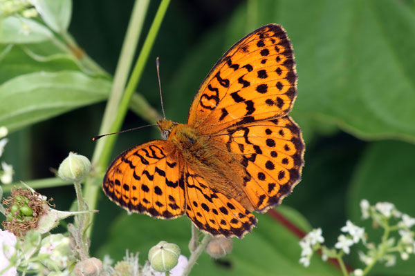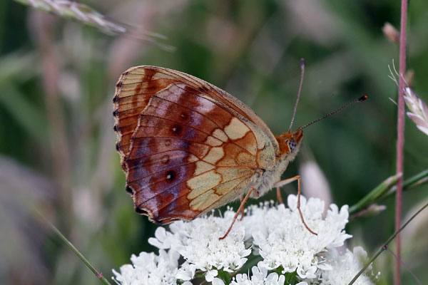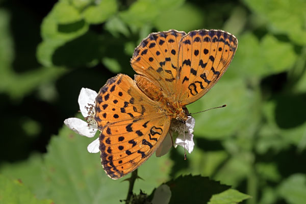 Male. Taken at Irinovac, Croatia, on June 5th 2017. (© David Hastings) (1/160th sec at f14) Female. Taken at Plazishte, Bulgaria on June 22nd 2014. (© David Hastings) (1/320th sec at f13) Underside. Taken at Zhelezari, Bulgaria, on June 21st 2014. (© David Hastings) (1/160th sec at f11) DescriptionFamily: Heliconiinae Wing span: 40-45mm The Marbled Fritillary is names after the marbling on the underside of the hind-wing. It is mainly found in southern and central Europe. It frequents bushy, flowery places, often in woodland clearings. It is univoltine, with adults being on the wing from late May to early August. It hibernates as an ovum or small larva. The laval foodplants are Bramble (Rubus fruticosus) and Raspberry (Rubus idaeus). Adults often feed on Bramble flowers. Sightings