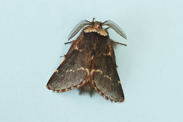 Male. Taken at Aston, Oxon., on November 6th 2023. (© David Hastings) (1/200th sec at f13) DescriptionFamily: Lasiocampidae (ABH : 66.001) Wing span: 30 - 34mm The cream and buff collar on a black thorax, and creamy-white cross-bands on the charcoal-coloured fore-wing make this moth unmistakable. The sexes are similar; the female is larger, and doesn't have feathered antennae. It can be found throughout the British Isles. It is most numerous in woodland, but is also frequent in scrub, hedgerows and gardens. There is one generation per year, from late October to January in southern Britain, and from early October in the north. It over-winters as an egg. Larvae feed on broad-leaved trees, including oaks, birches, elms, hawthorns, Blackthorn, poplars and sallows. It comes to light, but often fails to enter the trap. Earliest UK sighting: 5th November ; Latest UK sighting: 15th December Sightings