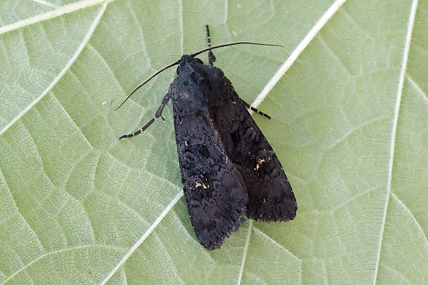 Taken at Aston, Oxon., on September 28th 2025. (© David Hastings) (Canon R6+RF100, f/11, 1/200th, ISO12800, 100mm) DescriptionFamily: Noctuidae (ABH : 73.233) Wing span: 34 - 42mm This is a consistently black or brownish-black moth. Its only conspicuous feature is the whiteish outer edging of the kidney mark. It doesn't have feathered antennae. It is widespread in the British Isles. Habitats are heathland, moorland, calcareous grassland, roadside verges, woodland rides and gardens. There is one generation in September and October. It over-winters as a small larva. Larvae feed on various woody and herbaceous plants, including Heather, Blackthorn and clovers. It comes to light and sugar, and feeds at flowers and blackberries. Earliest UK sighting: 10th September ; Latest UK sighting: 4th November Sightings