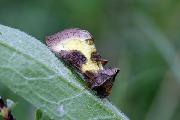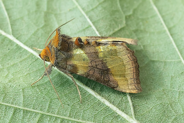 Form tutti. Taken at Bernwood Forest, Bucks, on June 15th 2014. (© David Hastings) (1/125th sec at f13) Form aurea. Taken at Aston, Oxon., on June 5th 2025. (© David Hastings) (1/100th sec at f/11) DescriptionFamily: Noctuidae (ABH : 73.012) Wing span: 32 - 38mm This species has a broad, hooked forewing with a bold, shiny, metallic yellow or greenish-yellow pattern. In form aurea the broad brown central cross-band is entire. In form tutti it is broken into two blotches. It is found throughout the British Isles. Habitats are gardens, hedgerows, ditch-banks, marshes, fens, wood edges and other rough sward. In the south of England there are two generations, June/July and August/September. There is often a partial second generation further north. In Scotland and Ireland there is one generation from June to early August. It over-winters as a small larva. The most frequent larval foodplant is Common Nettle, but other herbaceous plants are also used. It flies at dusk, when it visits flowers. It comes to light. Earliest UK sighting: 5th June ; Latest UK sighting: 26th September Sightings