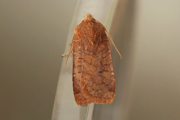 Taken at Aston, Oxon., on February 3rd 2023. (© David Hastings) (1/1000th sec at f8) DescriptionFamily: Noctuidae (ABH : 73.194) Wing span: 28 - 30mm This moth is distinguished from other brown noctuids flying in autumn and early spring by the rounded outer edge of its fore-wing. It is highly variable, and can be very plain or strongly marbled. The trailing half of the kidney mark is usually dark. The fore-wing ground colour is light or dark chestnut brown, or a mixture of the two. It can be found throughout the British Isles. It is most frequent in broad-leaved woodland, also in hedgerows, scrub and gardens. There is one generation, from September to May. It becomes active in mild weather. Larvae feed on oaks, elms, Blackthorn, Hawthorn, Downy Birch, Sweet chestnut and docks. In the autumn it is usually found feeding on ivy flowers and over-ripe berries. It is more frequent at light in late winter and spring. Earliest UK sighting: 29th January ; Latest UK sighting: 7th October Sightings
