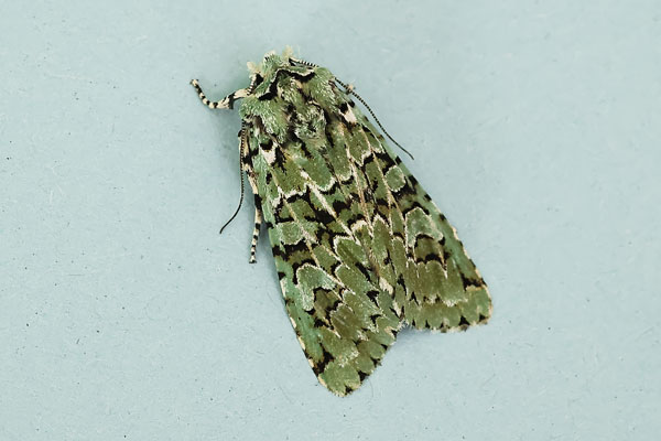 Taken at Aston, Oxon., on October 21st 2025. (© David Hastings) (Canon R6+RF100, f/10, 1/200th, ISO10000, 100mm) DescriptionFamily: Noctuidae (ABH : 73.224) Wing span: 36 - 46mm This moth is beautifully and uniquely marked. The fore-wing is broad with a curved leading edge, light pastel green with black markings, many of which are edged with white. It is common and widespread in the British Isles, although more local in Ireland. Habitats are broad-leaved woodland, parkland, hedgerows and some gardens (although not usually in urban areas). There is one generation per year in September and October. It over-winters as an egg. Larvae feed on the immature flowers, and leaves of Penduculate Oak, probably also Sessile Oak and possibly Turkey Oak. It comes to light, but often fails to enter the trap. It also comes to sugar and feeds at over-ripe berries and Ivy flowers. Earliest UK sighting: 21st October ; Latest UK sighting: 4th November Sightings