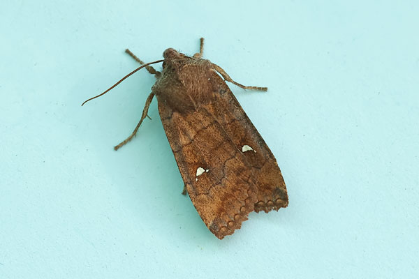 Taken at Aston, Oxon., on October 7th 2023. (© David Hastings) (1/250th sec at f11) DescriptionFamily: Noctuidae (ABH : 73.210) Wing span: 34 - 40mm This moth is unmistakable. Diagnostic features are a small white kidney mark on a richly coloured fore-wing, and two 'satellite' dots either side of it. It is widespread in England, Wales and mainland Scotland as far north as Caithness. Local in Ireland. Habitats are broad-leaved woodland, scrub, parkland and gardens. There is one generation per year, from October to late April. The adults hibernate. Larvae feed on a variety of broad-leaved trees and shrubs. When larger, they also prey on other moth larvae. It comes to light and sugar, and feeds at Ivy flowers and berries. Earliest UK sighting: 11th March ; Latest UK sighting: 13th November Sightings