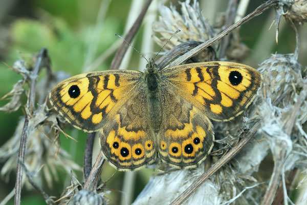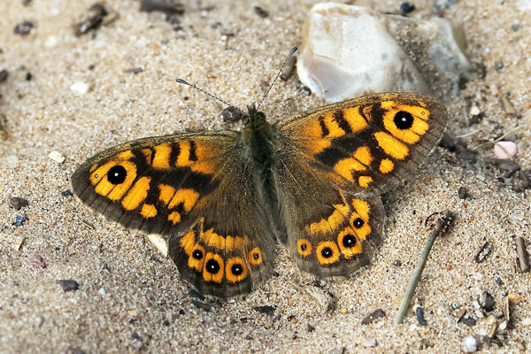Male. Taken at Holkham NNR, Norfolk on October 13th 2025. (© David Hastings) (Canon R7+RF100-500, f/10, 1/640th, ISO1250, 454mm) Male underside. Taken at Pewsey Downs, Wilts, on August 9th 2014. (© David Hastings) (1/400th sec at f11) Female. Taken at Overy MNarshes, Norfolk on October 13th 2025. (© David Hastings) (Canon R7+RF100-500, f/10, 1/800th, ISO1000, 500mm) Female underside. Taken at Tophill Low, E. Yorks, on August 22nd 2010. (© David Hastings) (1/400th sec at f11) DescriptionFamily: Satyrinae Wing span: 44 - 52 mm The Wall gets its name from its characteristic behaviour of resting with its wings two-thirds open on walls or other bare surfaces. This butterfly is found in relatively small self-contained colonies. It was once found throughout England, Wales and Ireland, but over the last few decades it has suffered a severe decline. The reason(s) for this decline are not known. It is found primarily in coastal areas, especially unimproved grassland, wasteland, cliff edges and hedgerows. In some areas it does manage to penetrate inland. There are usually two broods each year. The first appears around the first week of May, peaking towards the end of the month. The second brood emerges in early August, and in some years there is a partial third brood. These timings are shifted by about two weeks in northern England and Scotland. The larva is the over-wintering stage. The primary larval foodplants are various Bents, Cock's-foot, False Brome, Tor-grass, Wavy Hair-grass and Yorkshire-fog. Adults are avid feeders, favouring Daisy, Fleabane, Hawkweeds, Knapweeds, Marjoram, Ragged Robin, Ragwort, Thistles, Water Mint and Yarrow. Males are territorial and will inhabit a particular area, such as a path, hedgerow or roadside verge, waiting for passing females. Any intruding males are seen off. Females are much more sedentary. Least Concern Earliest UK sighting: 3rd May ; Latest UK sighting: 16th October Sightings
